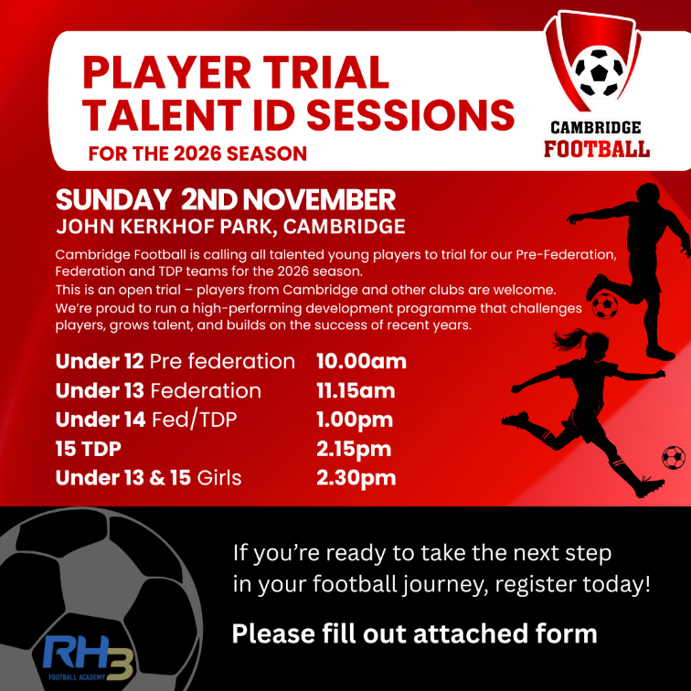 Cambridge FC has proudly gained accreditation as a Talent Development Programme (TDP) Club for our mixed/boys programme. Our 14th, 15th and 17th grade teams all compete in the NRFL Youth Competition.
